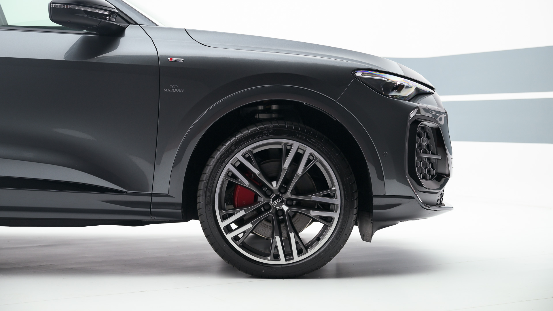 Cerchi in lega da 21" Audi Sport con design a 5 razze doppie a Y, grigio seta opaco, finitura tornita a specchio 8,5Jx21 con pneumatici 255/40 R21